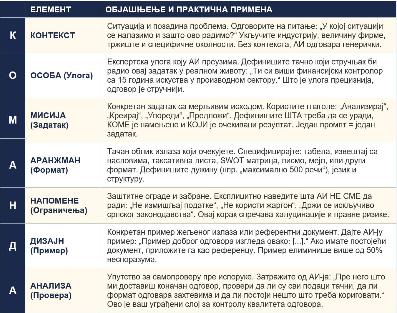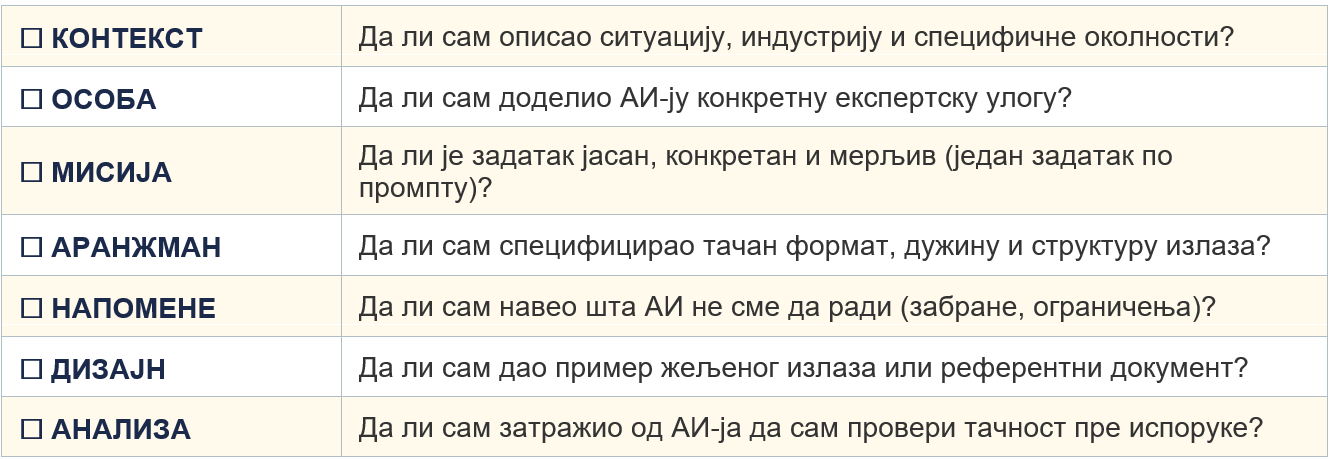 Контекст обезбеђује да АИ разуме вашу специфичну ситуацију уместо да одговара уопштено. Особа му додељује експертизу уместо да одговара као било ко. Мисија дефинише прецизан, мерљив задатак уместо нејасног захтева. Аранжман прописује тачан формат излаза уместо да АИ сам погађа шта вам треба. Напомене постављају заштитне ограде које спречавају халуцинације, измишљене податке и правне ризике. Дизајн даје конкретан пример жељеног резултата који елиминише више од половине неспоразума. Анализа захтева од АИ-ја да сам провери тачност свог одговора пре испоруке - класична контрола квалитета.