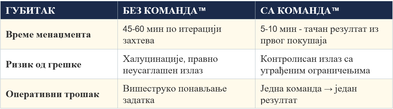 Ова метода је настала у окружењу где погрешан излаз значи изгубљено време руководиоца, погрешну одлуку или правно неусаглашен документ. Сваки елемент КОМАНДА™ формуле постоји зато што би његово одсуство, у пракси, произвело конкретну пословну штету.