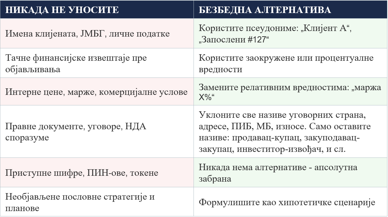 Сваки јавно доступан и бесплатан АИ модел (ChatGPT, Claude, Gemini и др.) складишти податке које уносите, како би их касније искористио у сврхе тренинга модела. Третирајући АИ као екстерног консултанта, примените исти ниво опреза као при дељењу података са трећим лицем.