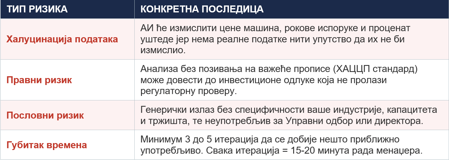 [К] КОНТЕКСТ: „Наша компанија је средње предузеће и произвођач прехрамбених производа (300 запослених, годишњи приход 12М ЕУР, тржиште Србије и региона). Тренутно користимо полуаутоматску линију за паковање капацитета 2.000 јединица/сат. Разматрамо инвестицију у потпуно аутоматизовану линију капацитета 5.000 јединица/сат, процењене вредности 400.000-500.000 ЕУР.“ [О] ОСОБА: „Ти си виши финансијски аналитичар са 15 година искуства у производном сектору, специјализован за инвестиционе студије оправданости (feasibility studies) у прехрамбеној индустрији Југоисточне Европе.“ [М] МИСИЈА: „Креирај студију оправданости инвестиције у нову линију за паковање. Анализа мора обухватити: (1) пројекцију РОИ-ја у периоду од 5 година, (2) анализу прага рентабилности (break-even), (3) идентификацију највећих 5 ризика са предложеним мерама ублажавања ризика, (4) упоредну анализу постојећег и новог решења по кључним КПИ-јевима.“ [А] АРАНЖМАН: „Формат: структуриран извештај са јасним насловима секција, максимално 1.500 речи. Укључи једну табелу за пројекцију новчаних токова (5 година) и једну матрицу ризика (ризик / вероватноћа / утицај / мера). Тон: професионалан, за презентацију Управном одбору. Језик: српски.“ [Н] НАПОМЕНЕ: „Не измишљај специфичне цене добављача већ користи опсеге које сам дао. Не дај правне савете. Ако немаш довољно података за неку тачку, експлицитно напиши: ‘Овај податак захтева додатно разјашњење од Вашег тима.’ Држи се искључиво контекста прехрамбене индустрије.“ [Д] ДИЗАЈН: „Пример структуре извештаја коју очекујем: 1) Увод и циљ анализе, 2) Опис постојећег стања, 3) Опис предложене инвестиције, 4) Финансијска пројекција (табела), 5) Анализа ризика (матрица), 6) Закључак са препоруком. Тон сличан McKinsey извештајима: концизан, са јасним препорукама.“ [А] АНАЛИЗА: „Пре него што ми доставиш коначан извештај: (1) Провери да ниједан финансијски податак није измишљен - сваки број мора бити изведен из инпута које сам дао или означен као ‘захтева верификацију тима’. (2) Провери да формат тачно одговара захтевима из тачке Аранжман. (3) Провери да ниједна реченица не садржи правни савет.“