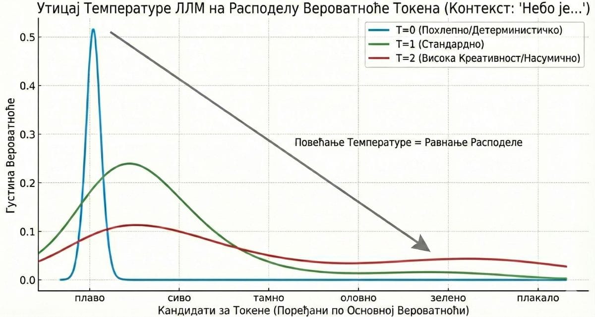 Температура је, у суштини, мера контролисаног нереда у систему, и она функционише на начин који је интуитивно доступан чак и без дубљег математичког предзнања. Када се температура спусти близу нуле, модел потпуно елиминише случајност из свог процеса одлучивања - он постаје детерминистички, што значи да ће на идентичан улаз увек, без икаквог одступања, произвести идентичан излаз.